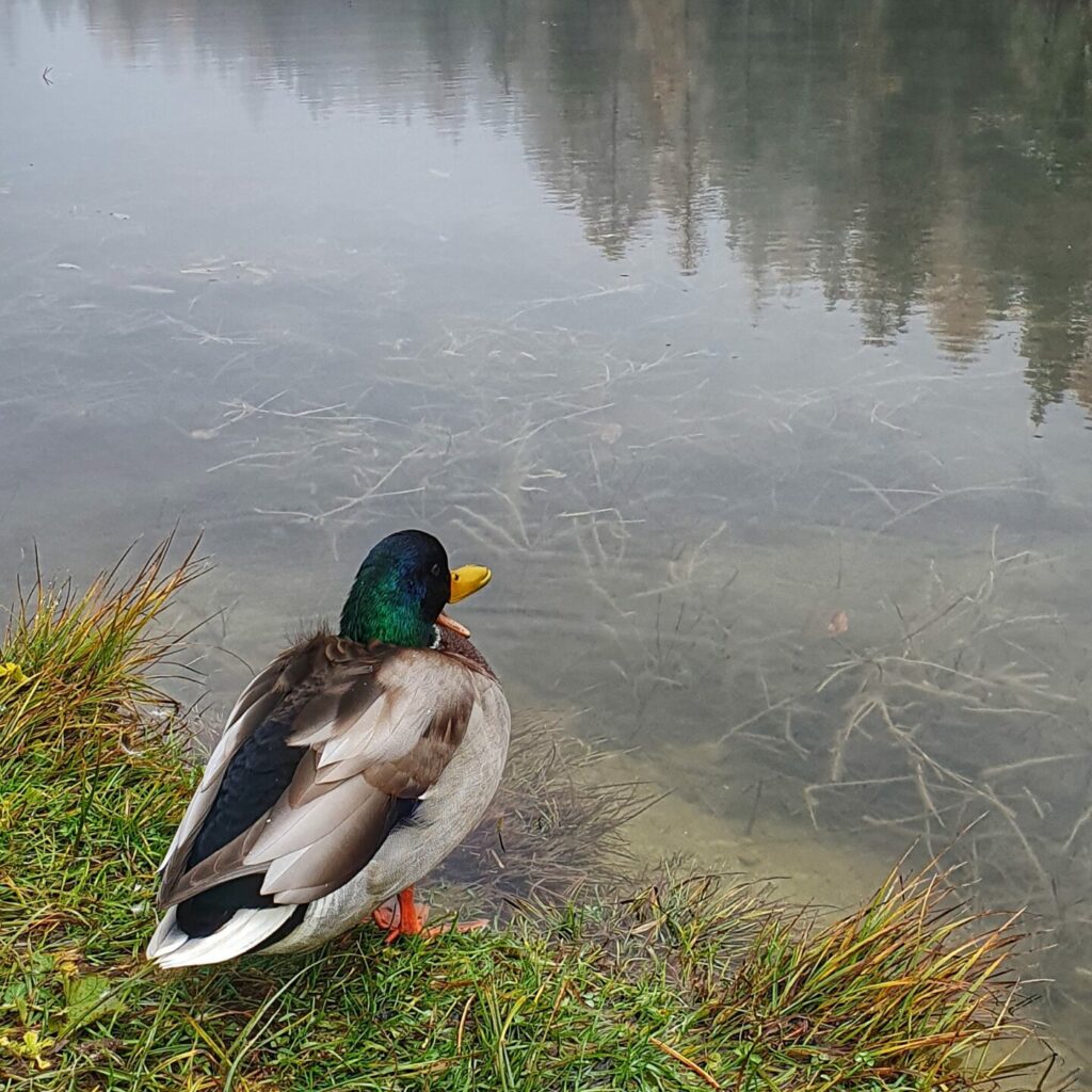 Na miejscu szybko jednak przekonaliśmy się, że rzeczywistość bywa przewrotna — jezioro faktycznie było, kaczki też… ale samych szczytów nie było widać ani trochę. Pospacerowaliśmy chwilę, zrobiliśmy kilka fotek i ruszyliśmy dalej.