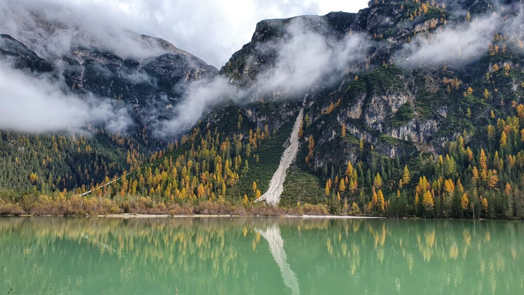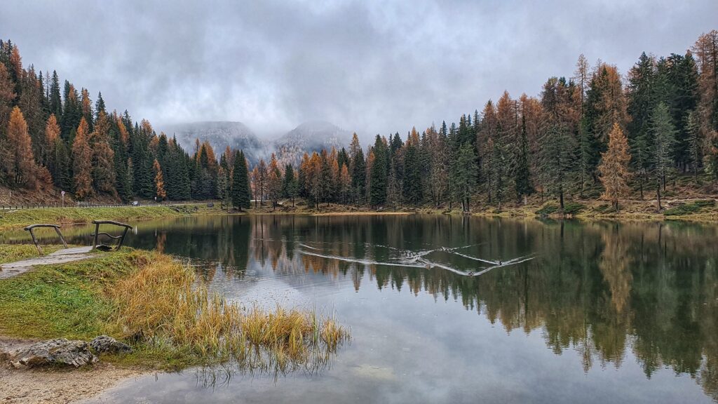 Następną próbę spaceru podjęliśmy przy Lago di Landro — kolejnym z pięknych jezior położonych przy drodze z Cortina d’Ampezzo w stronę Dobbiaco. To miejsce ma w sobie coś surowego: z jednej strony otoczone jest gęstym lasem, z drugiej rozciąga się wspaniały widok na masyw Cristallo i Punta dei Tre Scarperi.