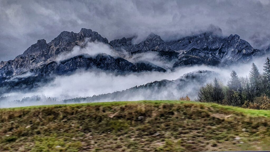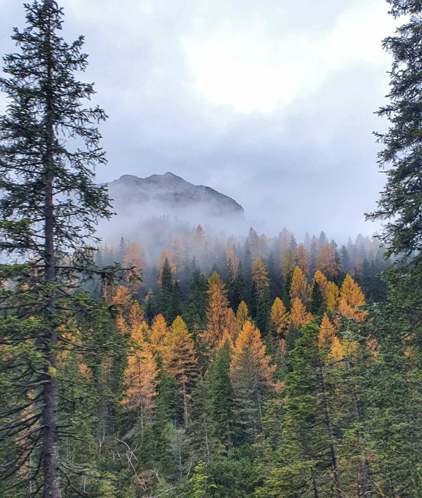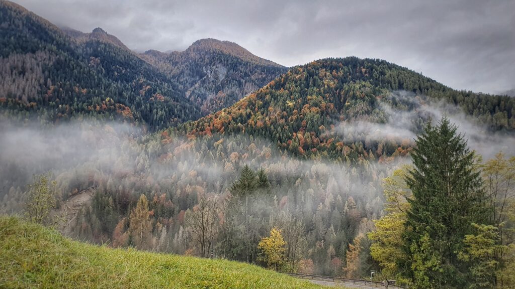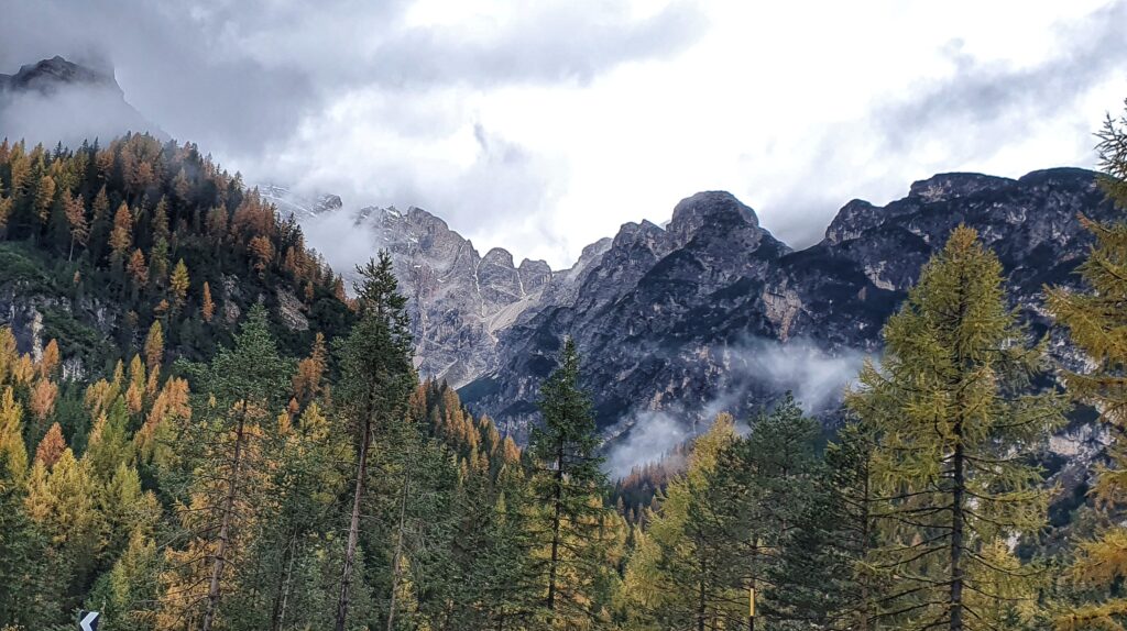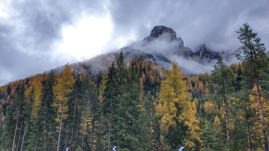 Wracaliśmy do hotelu otoczeni gęstą mgłą i szarością popołudniowego nieba. Mimo kapryśnej pogody każdy zakręt drogi odsłaniał kolejne niezwykłe widoki — jakby Dolomity żegnały nas na swój sposób.