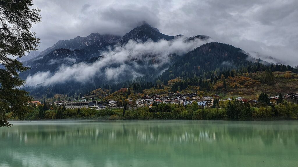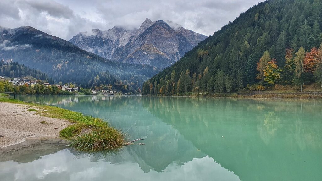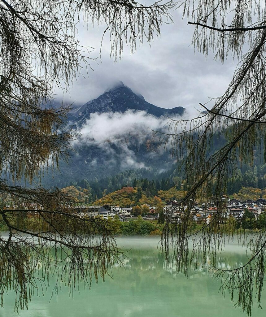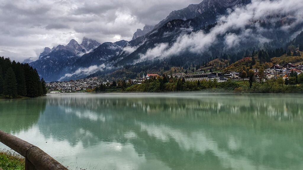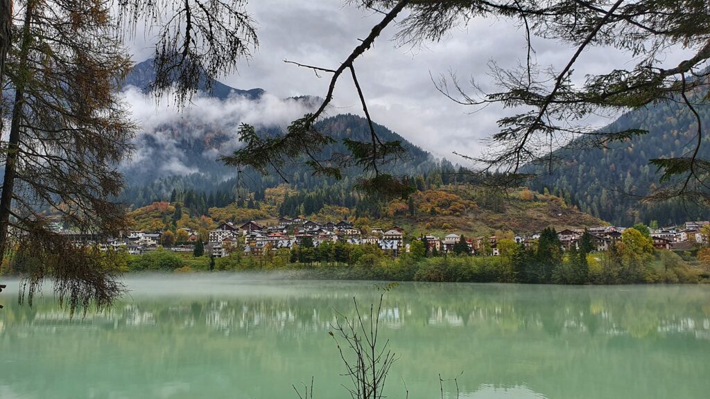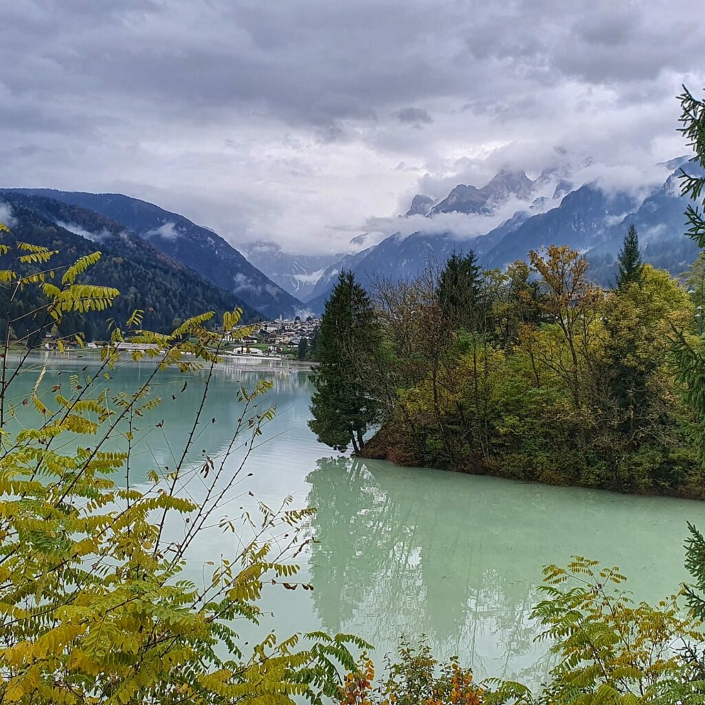 Naszym ostatnim przystankiem tego dnia było Lago di Santa Caterina, zwane też Lago di Auronzo. To sztuczne jezioro położone w samym sercu Auronzo di Cadore, na wysokości ok. 830 m n.p.m. Powstało w latach 30. XX wieku, kiedy wybudowano tamę na rzece Ansiei, tworząc zbiornik służący do zasilania elektrowni wodnej.