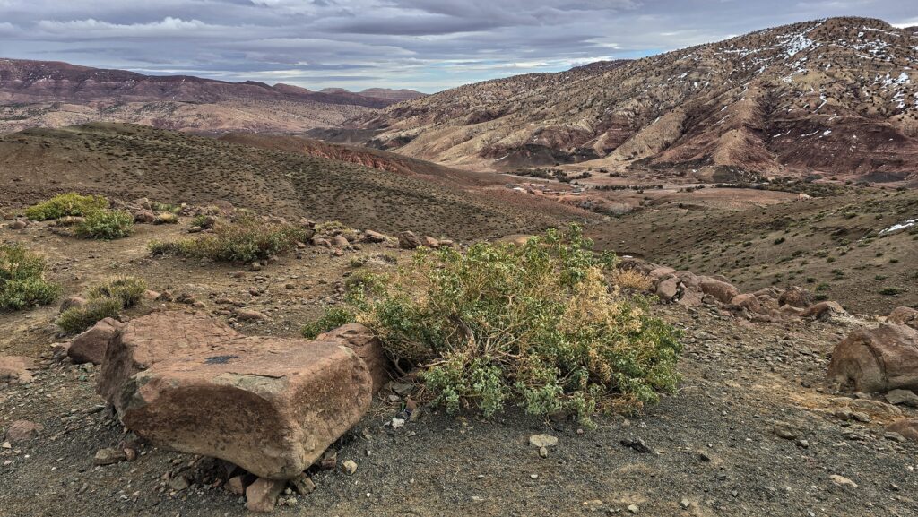 Po zjechaniu z drogi krajowej w kierunku Telouet bardzo szybko zmienił się nam krajobraz. Wiatr zdecydowanie się uspokoił, a góry przybrały zupełnie inne barwy. Wróciły odcienie czerwieni i brązu, a surowy, zimowy pejzaż ustąpił miejsca spokojniejszemu i bardziej stonowanemu.