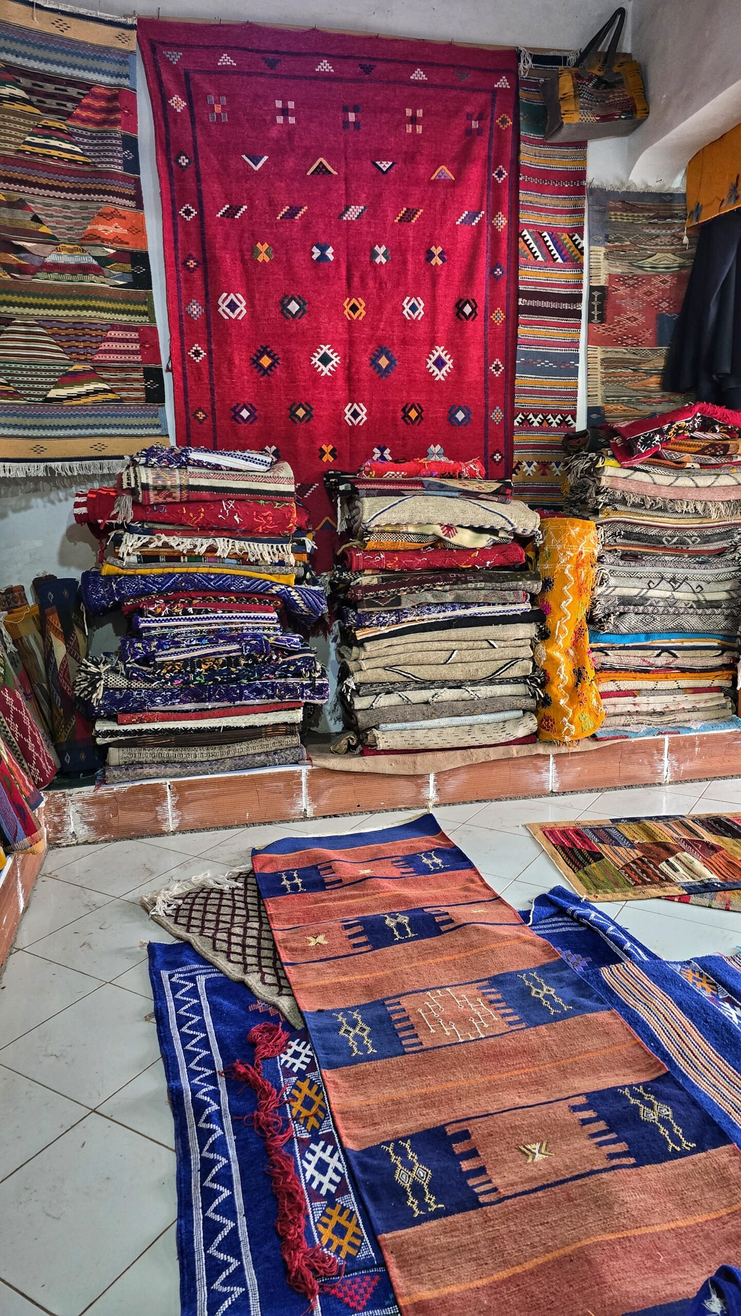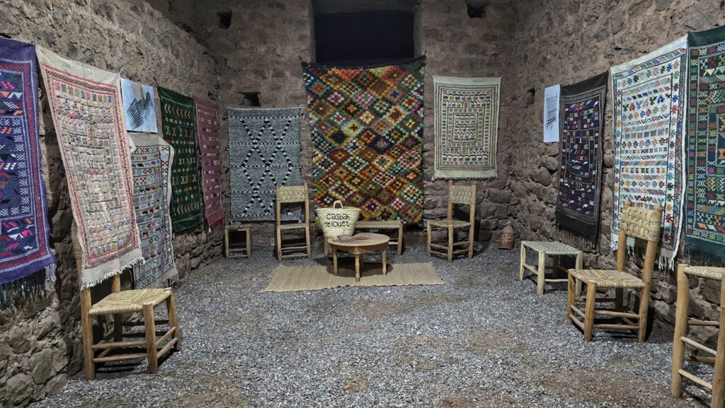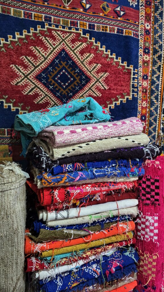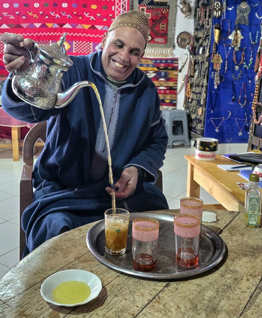 Po wyjściu z kasby naszym oczom ukazały się ręcznie tkane dywany, rozwieszone przed niewielkim, niepozornym wnętrzem. Weszliśmy tam bez większych oczekiwań, nie wiedząc, że przy okazji trafimy na herbatkę u Berbera. Gospodarz z uśmiechem zaprosił nas do środka i opowiedział o tradycji parzenia berberyjskiej zielonej herbaty — mocnej, bardzo słodkiej, z dodatkiem świeżej mięty. Dowiedzieliśmy się też, że herbatę zawsze nalewają mężczyźni, bo sam sposób nalewania traktowany jest tu niemal jak sztuka.
