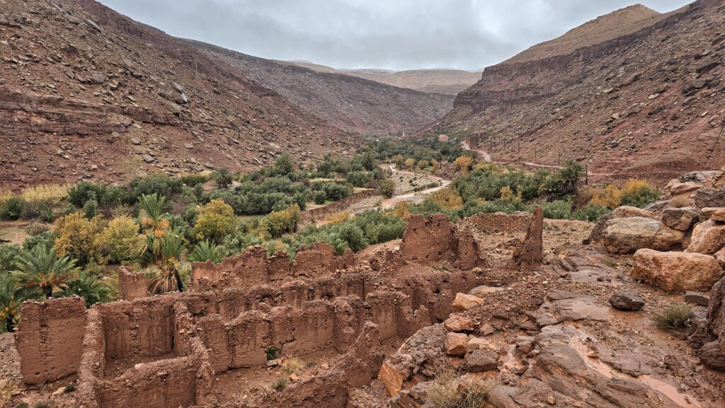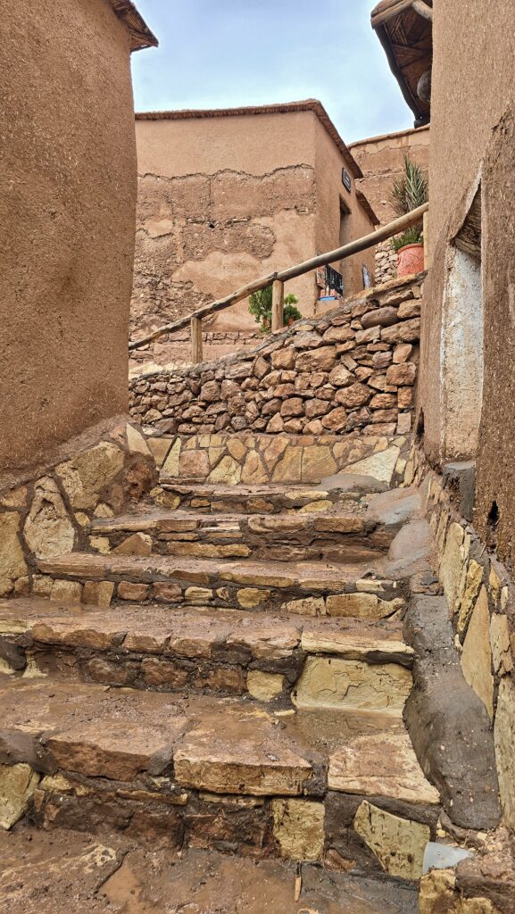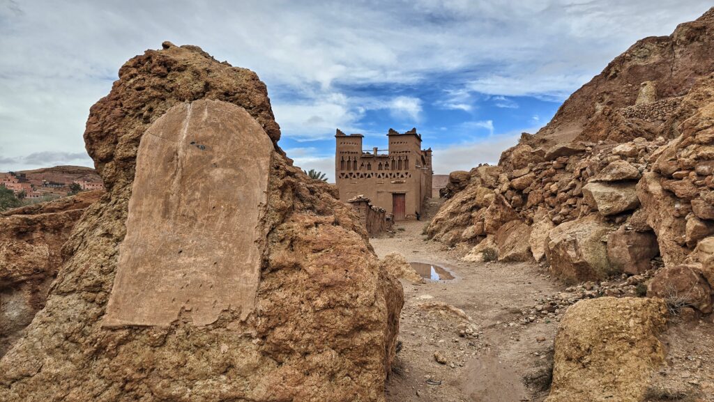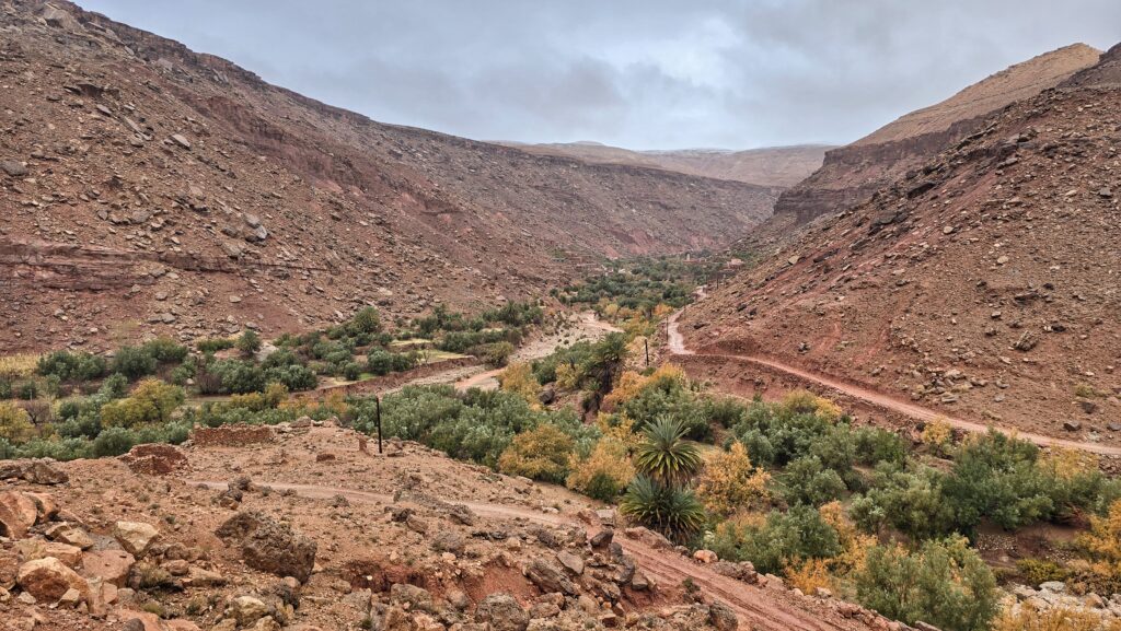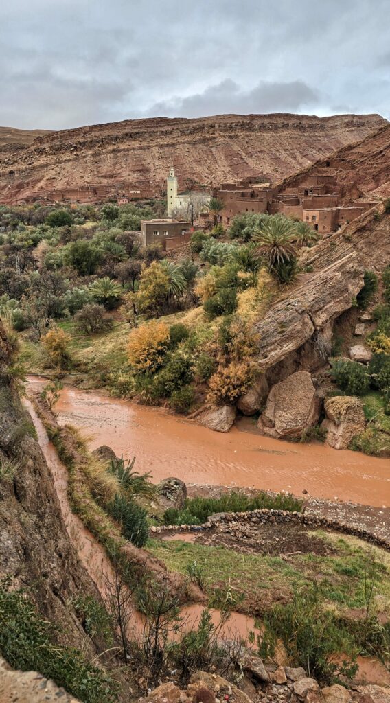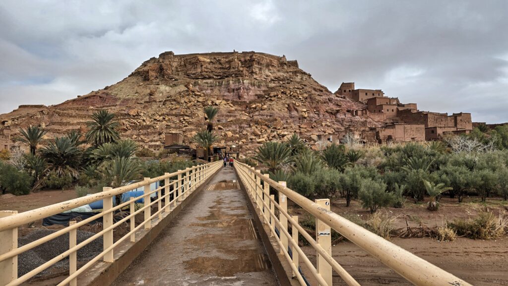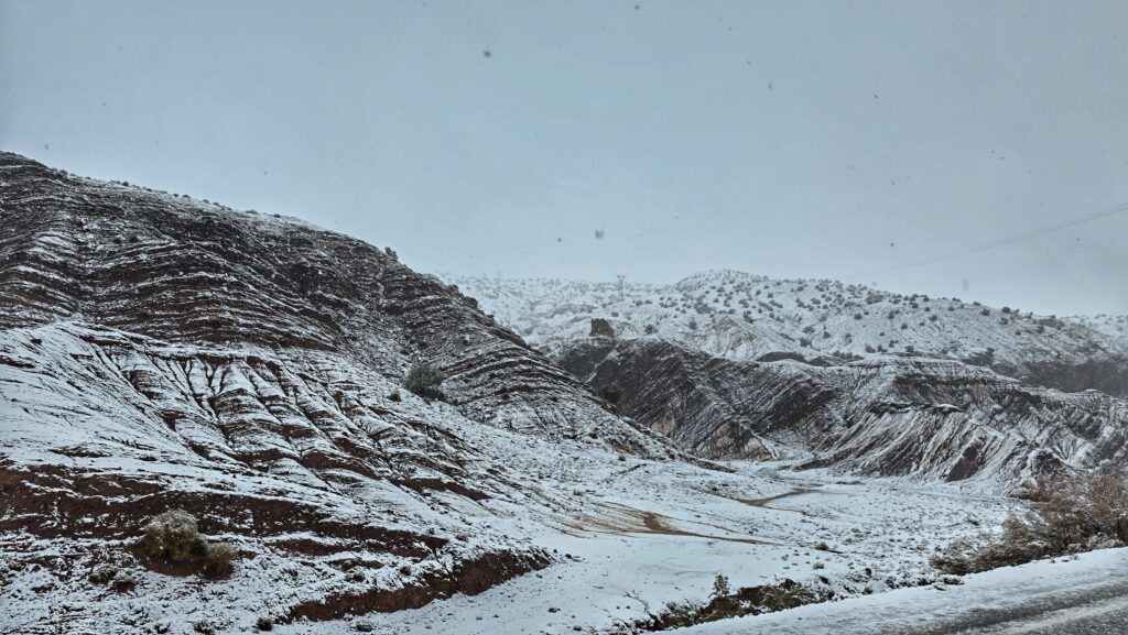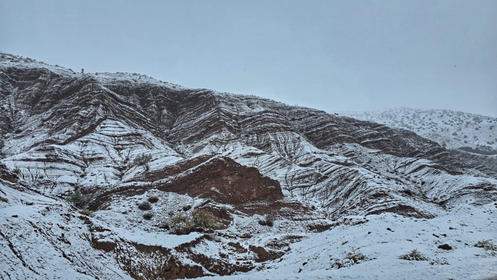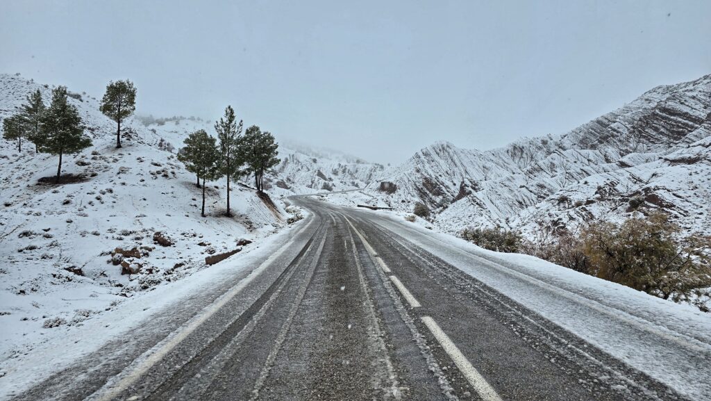 Poranek w Telouet nieco nas zaskoczył. Myśleliśmy, że przynajmniej w Maroku ominie nas odśnieżanie auta. A tu niespodzianka — w nocy spadło kilkanaście centymetrów białego puchu, co przy uniwersalnych oponach okazało się nie lada wyzwaniem. Na szczęście temperatura była dodatnia, więc to, co spadło, dość szybko zaczęło się topić. Po kilkunastu kilometrach jazdy zamiast śniegu mieliśmy… błoto!