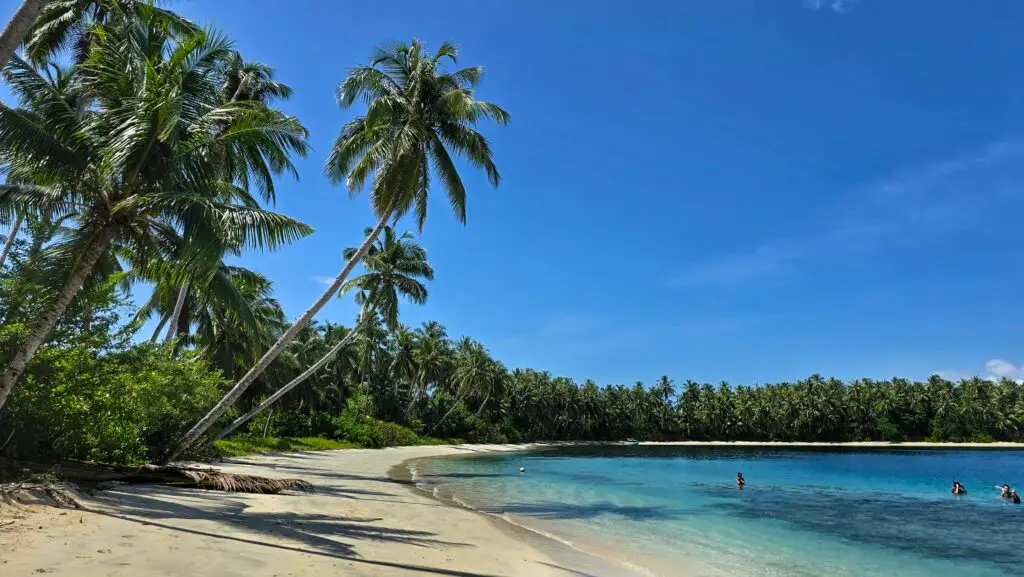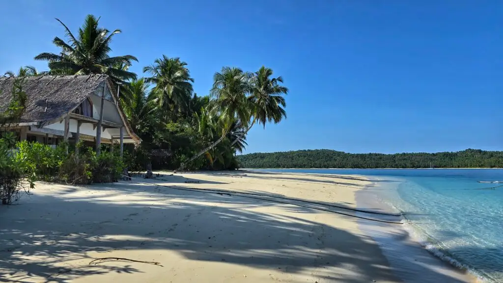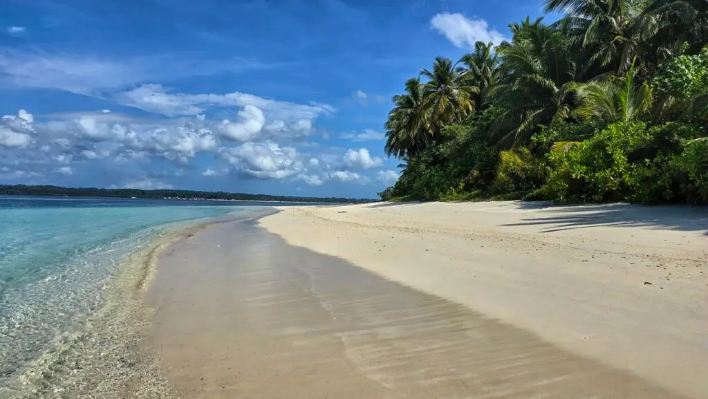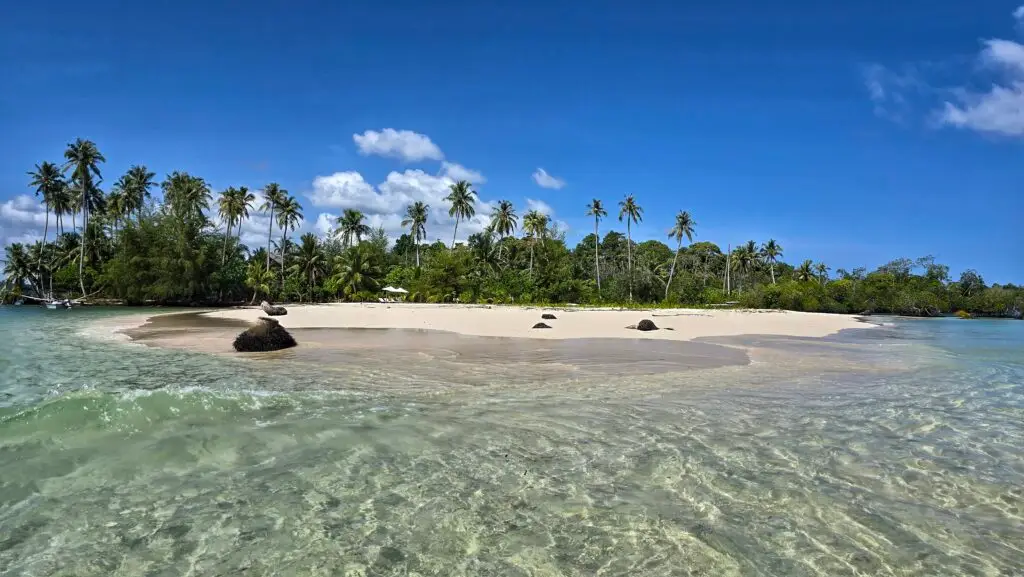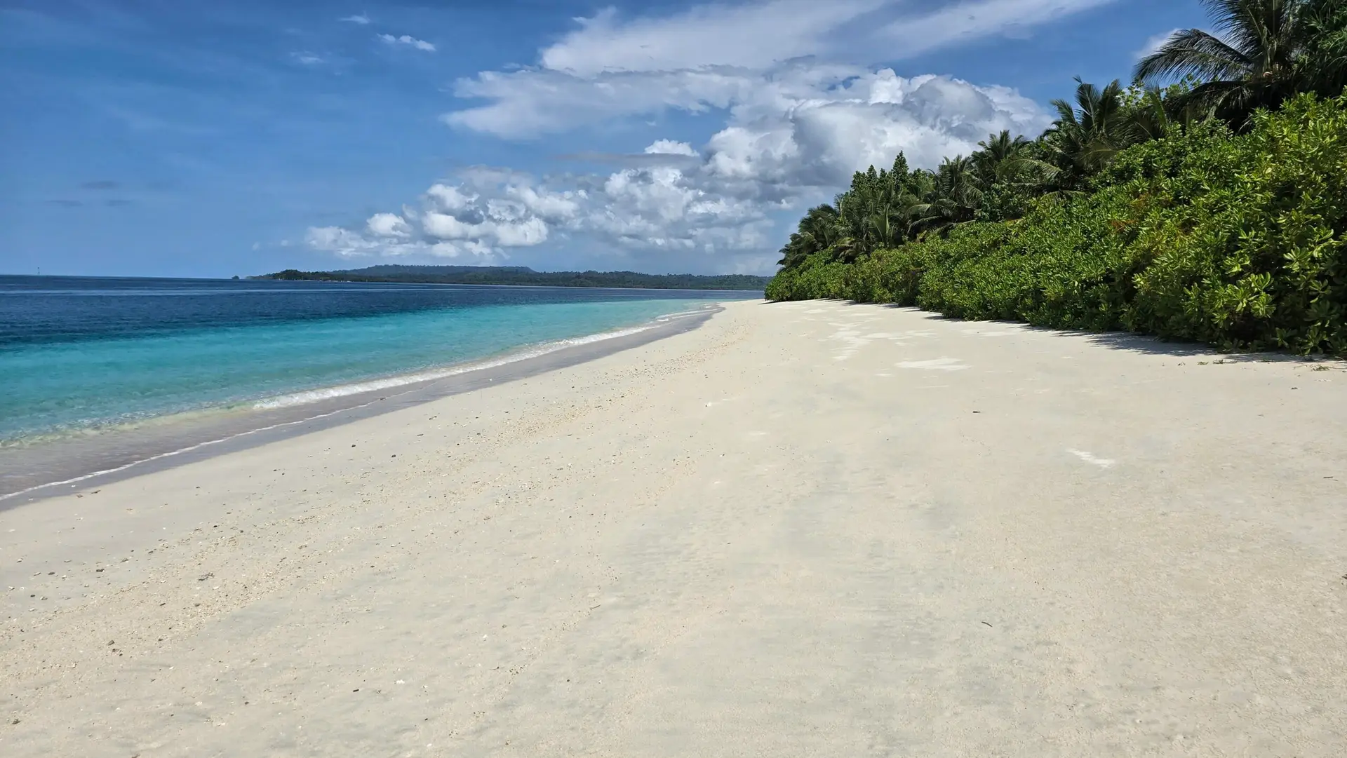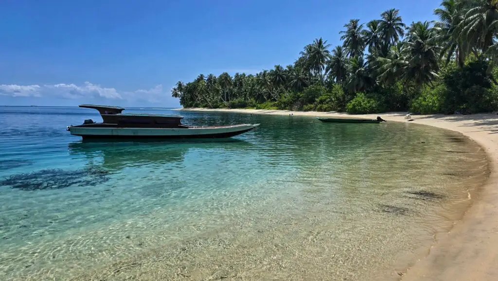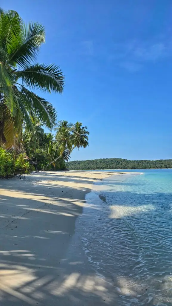 Kolejnym przystankiem była wyspa Siburu. Jest nieco większa od Patotogat, ale kiedy dopłynęliśmy do brzegu, również nie było tu nikogo. Mieliśmy dla siebie kilkaset metrów plaży, która wyglądała jak z tropikalnej fototapety – wysokie palmy pochylające się nad wodą, turkusowa laguna i drobny, niemal biały piasek.