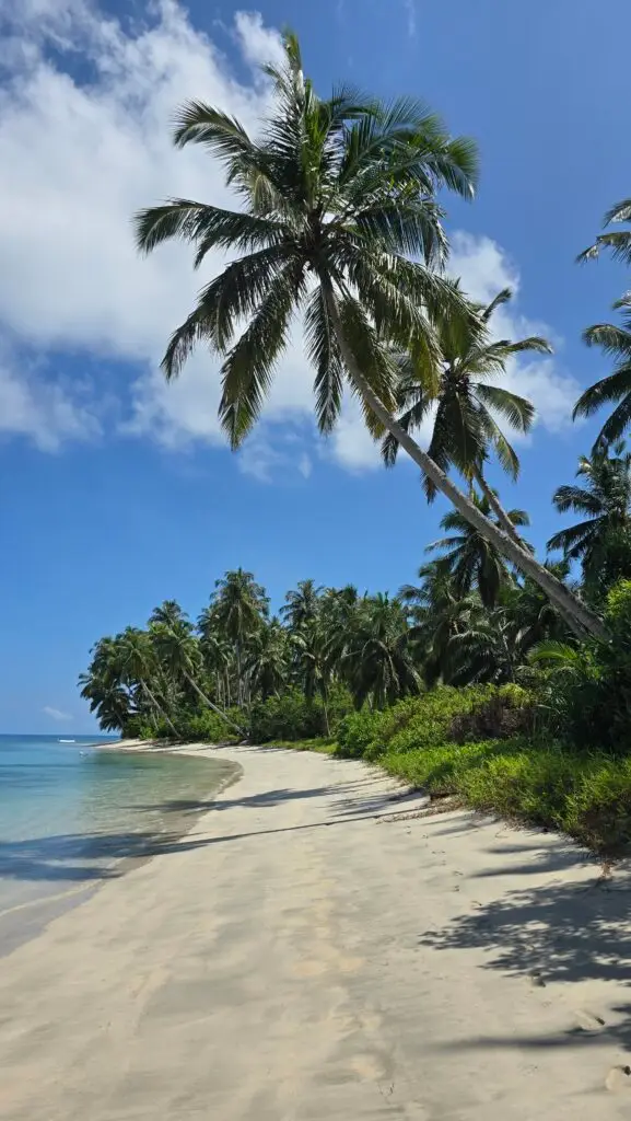 Z trzech odwiedzonych wysp to właśnie tutaj piasek był najbielszy i najdrobniejszy. Spacer wzdłuż brzegu był wyjątkową przyjemnością – zwłaszcza że z każdą chwilą przybywało cienia, a słońce, mimo że smarowaliśmy się kremem kilka razy w ciągu dnia, zdążyło nas już dość solidnie opalić.
