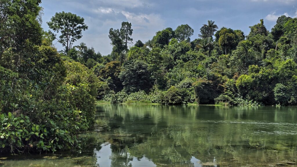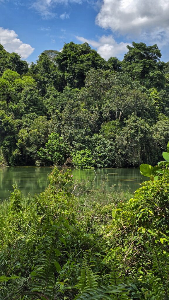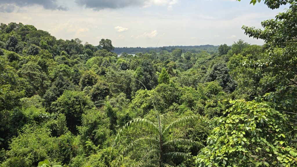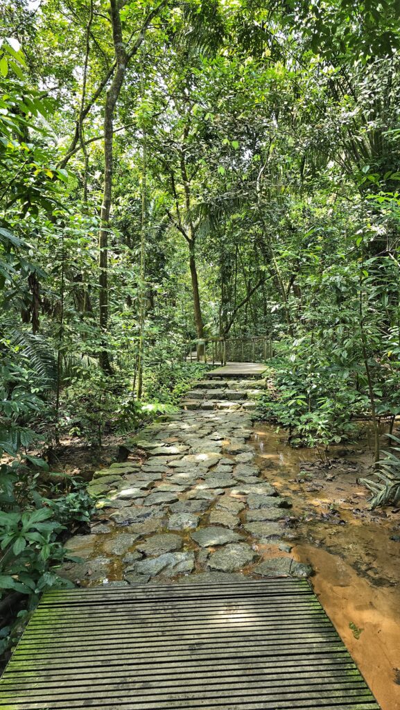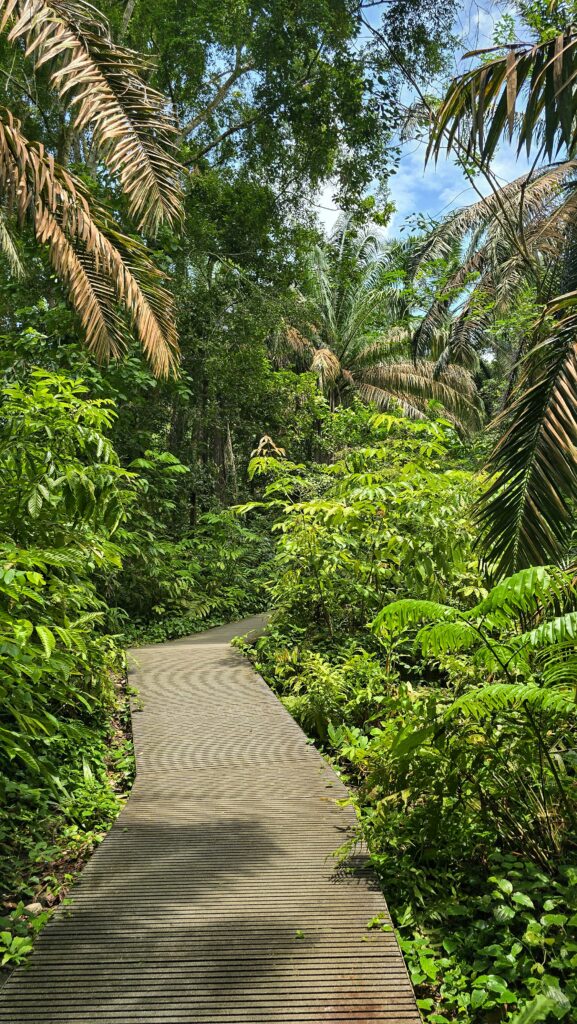 Nie było więc wielkiego wyboru. Pozostało iść dalej — wzdłuż zbiornika MacRitchie — i robić to, co w takich momentach wychodzi najlepiej: zachwycać się widokami i udawać, że zupełnie nie widzimy coraz większych jaszczurek pojawiających się na ścieżce. Zielona tafla wody co chwilę przebijała się przez gęstą roślinność, a pojawiające się czasem drewniane kładki prowadziły nas raz bliżej brzegu, raz głębiej w dżunglę.