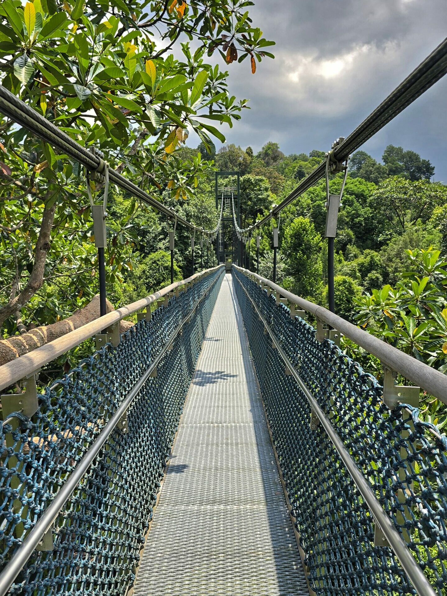 Dopiero później dowiedzieliśmy się, że to słynny HSBC TreeTop Walk. Sam most ma około 250 metrów długości i jest zawieszony mniej więcej 25 metrów nad ziemią. Może nie brzmi to jak coś ekstremalnego, ale kiedy stanęliśmy na nim pierwszy raz, wszystko wyglądało już zupełnie inaczej.